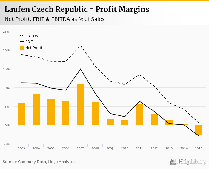 Laufen Czech Republic made a net profit of CZK -70.3 mil with revenues of CZK 2,794 mil in 2015, down by 1% and up by 13.4%, respectively, compared to the previous year.