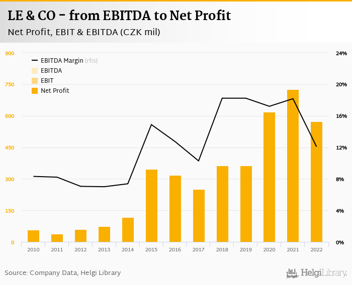 LE & CO made a net profit of CZK 572 mil with revenues of CZK 5,807 mil in 2022, down by 21.2% and up by 12.6%, respectively, compared to the previous year. This translates into a net margin of 9.86%.