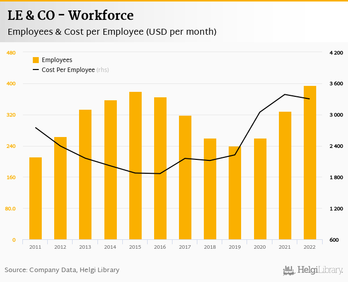 LE & CO employed 395 employees in 2022, up 20.4% compared to the previous year. Historically, between 2011 and 2022, the firm's workforce hit a high of 395 employees in 2022 and a low of 211 employees in 2011.