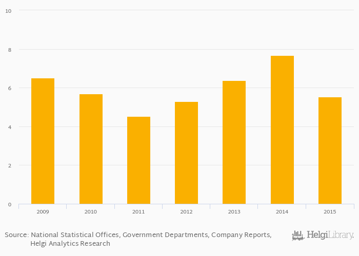 Historically, lead (mine) production in Kosovo reached an all time high of 7.68 kt in 2014 and an all time low of 4.53 kt in 2011.