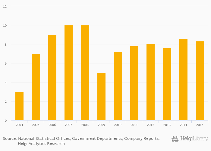 Historically, lead (refined) production in Estonia reached an all time high of 10.0 kt in 2008 and an all time low of 3.00 kt in 2004.
