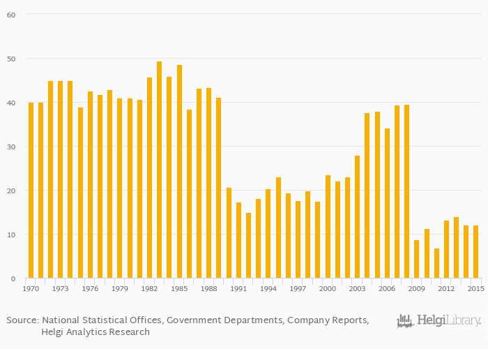Romania has been ranked 44th within the group of 63 countries we follow in terms of lead (refined) production, 14 places below the position seen 10 years ago.