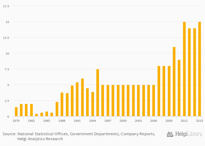 Historically, lead (refined) production in Nigeria reached an all time high of 15.0 kt in 2015 and an all time low of 0.400 kt in 1983.