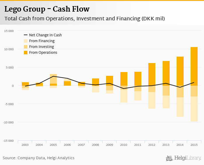 Lego Group's operating cash flow stood at DKK 10,559 mil in 2015, up 32.9% when compared to the previous year. Historically, between 2003 - 2015, the firm’s operating cash flow reached a high of DKK 10,559 mil in 2015 and a low of DKK 587 mil in 2005.