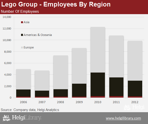 In 2012, the Company employed 9,853 persons. This was nearly 51% more than in 2003. In the same period, the average staff cost increased by only 12.8% per employee in the USD terms, to USD 5,614 per employee and month in 2012. Over 70% of Lego's employees were based in Europe at the end of 2012