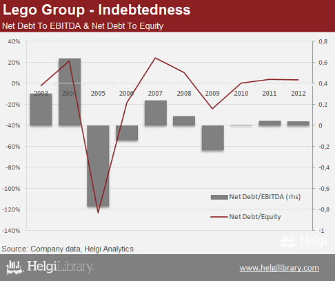 From losing nearly DKK 1.6 bil in 2004, or a third of the previous year's equity, The Lego Group has made an incredible recovery. In 2012, the privately held manufacturer of toys based in Billund, Denmark made a net profit of nearly DKK 5.6 bil. Compared to the year 2004, Company's sales have increased 3.5-fold to DKK 23.4 bil while average ROE reached 73% in 2010-2012. That's without any debt, of course...