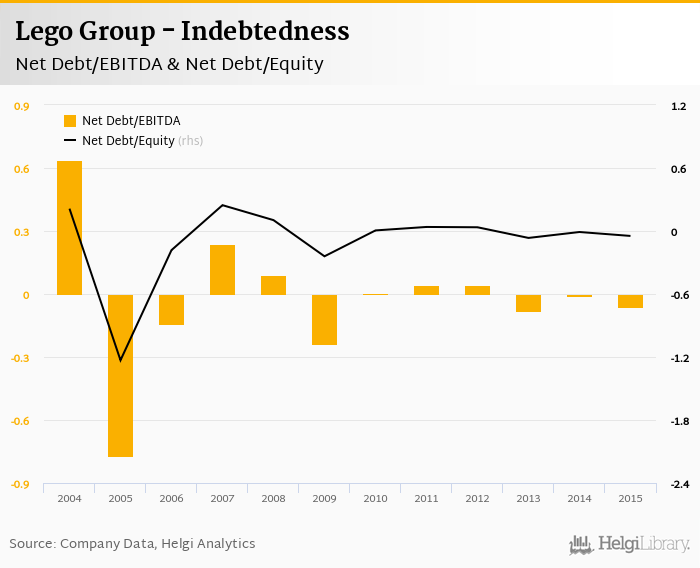 Lego Group's net debt stood at DKK -835 mil and accounted for -0.047 of equity at the end of 2015. The ratio is down 0.037 pp compared to the previous year.