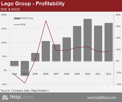 From losing nearly DKK 1.6 bil in 2004, or a third of the previous year's equity, The Lego Group has made an incredible recovery. In 2012, the privately held manufacturer of toys based in Billund, Denmark made a net profit of nearly DKK 5.6 bil. Compared to the year 2004, Company's sales have increased 3.5-fold to DKK 23.4 bil while average ROE reached 73% in 2010-2012. That's without any debt, of course...