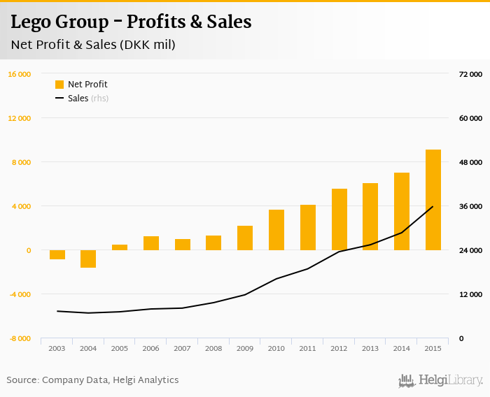 Lego Group made a net profit of DKK 9,174 mil in 2015, up 30.6% compared to the previous year. Total sales reached DKK 35,780 mil, which is up 25.2% when compared to the previous year.