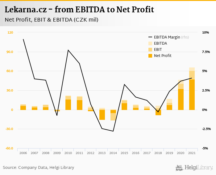 Lekarna.cz made a net profit of CZK 47.4 mil with revenues of CZK 1,610 mil in 2021, up by 45.5% and up by 26.6%, respectively, compared to the previous year. This translates into a net margin of 2.95%.