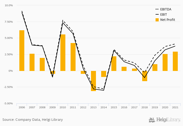 This translates into a net margin of 2.95%. Historically, between 2006 and 2021, the firm’s net margin reached a high of 6.19% in 2006 and a low of -3.08% in 2013. The average net margin in the last five years amounted to 1.06%.