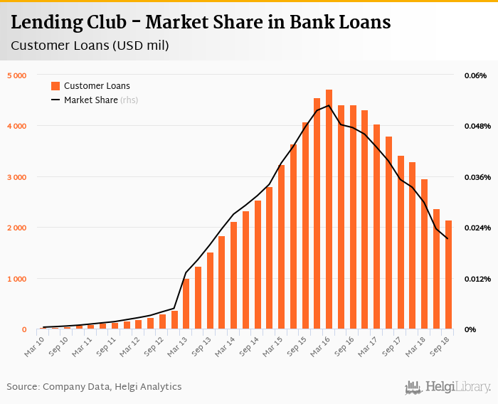 Lending Club accounted for 0.021% of all customer loans issued in USA at the end of 2018-09-30. Historically, the bank’s market share in customer loans reached an all time high of 0.053% in 2016-03-31 and an all time low of < 0.001% in 2010-03-31.