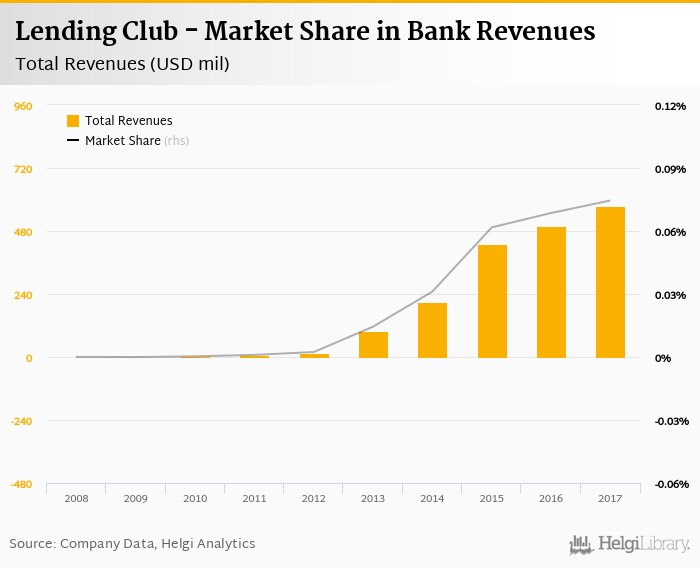 As a result, Lending Club accounted for 0.075% of all bank revenues generated by banks in USA in 2017. Historically, the bank’s market share in total revenues reached an all time high of 0.075% in 2017 and an all time low of < -0.001% in 2009.