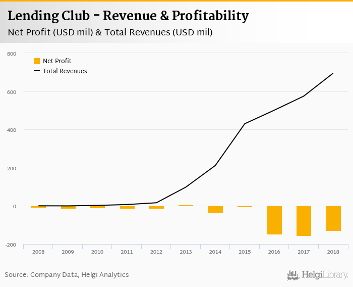 Lending Club made a net profit of USD -128 mil under revenues of USD 695 mil in 2018, up 16.6% and 20.9% respectively compared to the previous year.