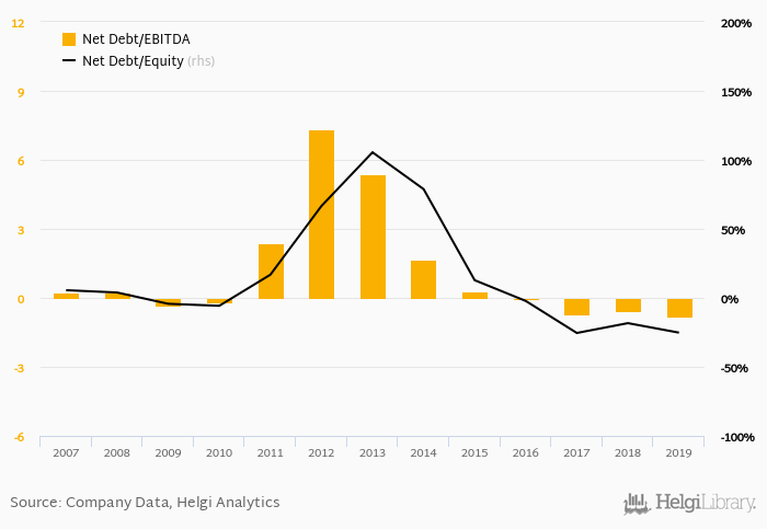 Net debt to EBITDA was calculated at -0.819x at the end of the year. That is down from 1.65x seen in 2014. The ratio reached a high of 7.35x in 2012 and a low of -0.819x in 2019.
