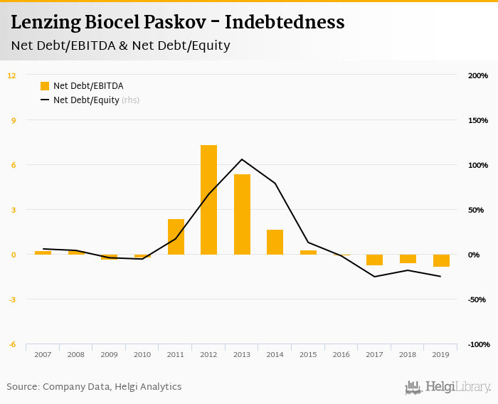 Lenzing Biocel Paskov's net debt stood at CZK -1,587 mil and accounted for -25.2% of equity at the end of 2019. The ratio is down 6.88 pp compared to the previous year.