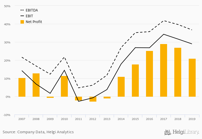 On the operating level, the EBITDA margin reached 36.7% and EBIT amounted to 29.0% of sales in 2019.