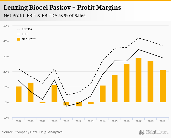 Lenzing Biocel Paskov made a net profit of CZK 1,111 mil with revenues of CZK 5,285 mil in 2019, down by 21.6% and up by 0.683%, respectively, compared to the previous year.