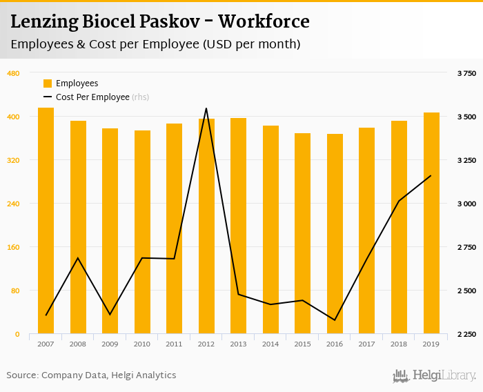 Lenzing Biocel Paskov employed 407 employees in 2019, up 3.56% compared to the previous year. Historically, between 2006 and 2019, the firm's workforce hit a high of 443 employees in 2006 and a low of 368 employees in 2016.