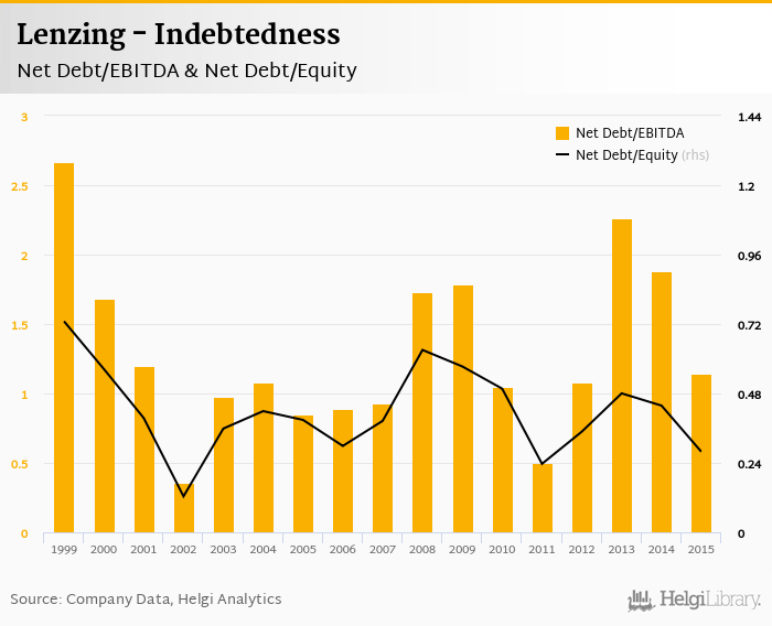 Lenzing's net debt stood at EUR 336 mil and accounted for 0.278 of equity at the end of 2015. The ratio is down 0.160 pp compared to the previous year.