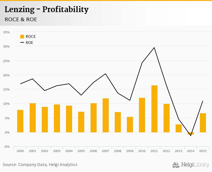 Lenzing made a net profit of EUR 123 mil in 2015, up 1% compared to the previous year. Historically, between 1999 and 2015, the company's net profit reached a high of EUR 259 mil in 2011 and a low of EUR -13.5 mil in 2014.