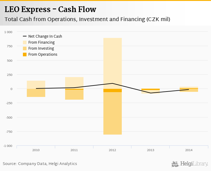 At the end of 2014, the company had a net debt of CZK 811 mil, or -233x of EBITDA and -4.78 of equity. Net working capital amounted to CZK -7.21 mil, or -4.05% of sales. The cash conversion cycle stood at -32.1 days in 2014. This is a deterioration compared to the previous year (-9.14 days), so LEO Express’s working capital was tied up for 23.0 more days.