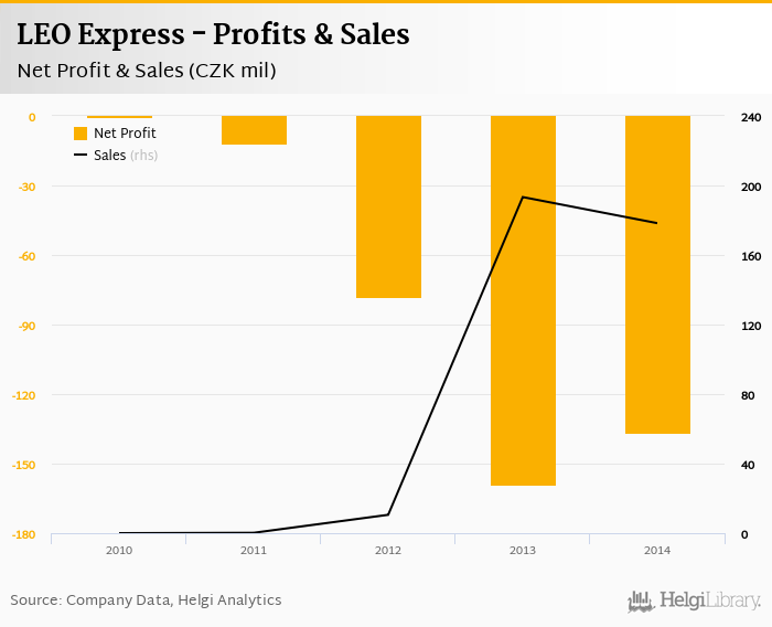 LEO Express made a net profit of CZK -137 mil in 2014, up 14.1% compared to the previous year. Total sales reached CZK 178 mil, which is down 7.76% when compared to the previous year.