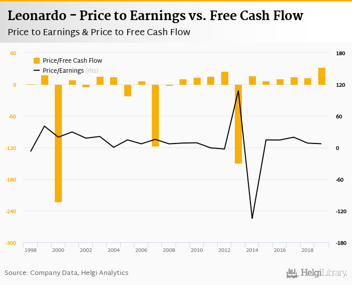 Regarding cash generated defined by the sum of net profit and depreciation, the stock traded at 4.89x at the end of 2019. When investments are excluded to get free cash flow, Leonardo traded at 32.8x.