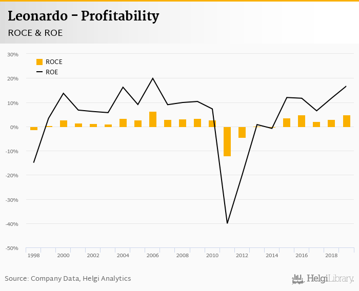 Leonardo made a net profit of EUR 821 mil in 2019, up 61.3% compared to the previous year. Historically, between 1998 and 2019, the company's net profit reached a high of EUR 988 mil in 2006 and a low of EUR -2,345 mil in 2011.