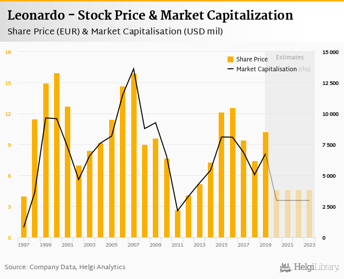 Leonardo stock traded at EUR 10.2 per share at the end 2019 implying a market capitalization of USD 6,747 mil.
