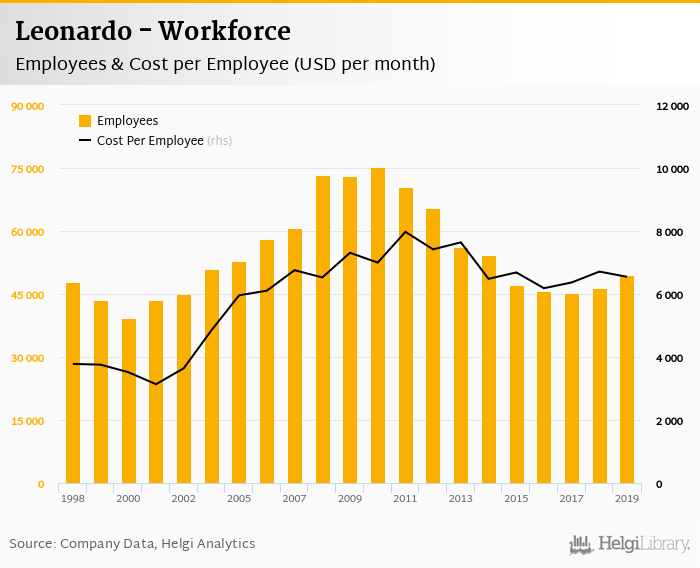 Leonardo employed 49,530 employees in 2019, up 6.6% compared to the previous year. Historically, between 1998 and 2019, the firm's workforce hit a high of 75,197 employees in 2010 and a low of 39,370 employees in 2000.