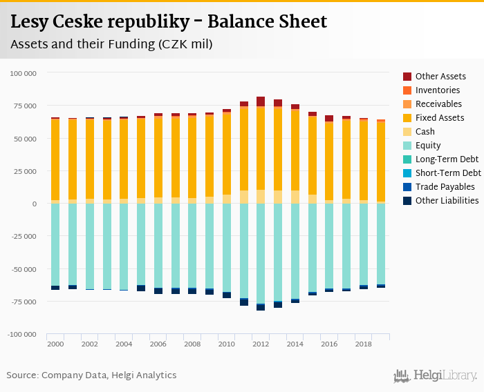 Lesy Ceske republiky's total assets reached CZK 64,814 mil at the end of 2019, down 0.855% compared to the previous year.