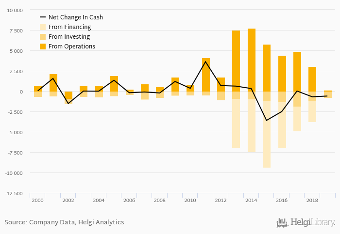 Cash from financing amounted to CZK 18.0 mil, so the company generated CZK -607 mil net cash in 2019.