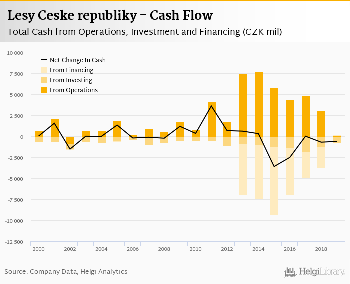 At the end of 2019, the company had a net debt of CZK -1,699 mil, or 30.7x of EBITDA and -2.75% of equity. Net working capital amounted to CZK 1,443 mil, or 20.1% of sales. Cash conversion cycle is negative and reached 74.4 days days in 2019. This means Lesy Ceske republiky generates revenue from customers before it has to pay its suppliers for inventory, among other things.