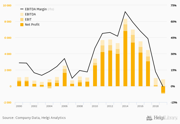 Historically, between 2000 - 2019, the firm’s net profit reached a high of CZK 6,818 mil in 2014 and a low of CZK -788 mil in 2019. Since 2014, the firm's net profit has decreased 112% or % a year on average.