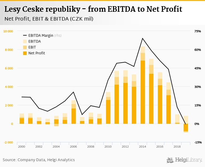 Lesy Ceske republiky made a net profit of CZK -788 mil with revenues of CZK 7,195 mil in 2019, down by 1% and down by 5.28%, respectively, compared to the previous year. This translates into a net margin of -11.0%.