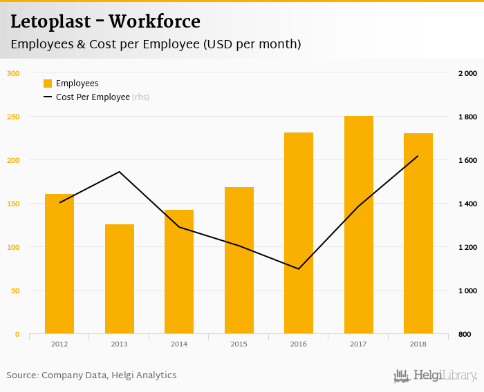 Letoplast employed 231 employees in 2018, down 7.97% compared to the previous year. Historically, between 2012 and 2018, the firm's workforce hit a high of 251 employees in 2017 and a low of 126 employees in 2013.