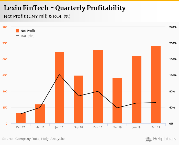 Lexin FinTech made a net profit of CNY 724 mil in the third quarter of 2019, up 62% when compared to the same period of last year. This implies a return on equity of 51.4%.