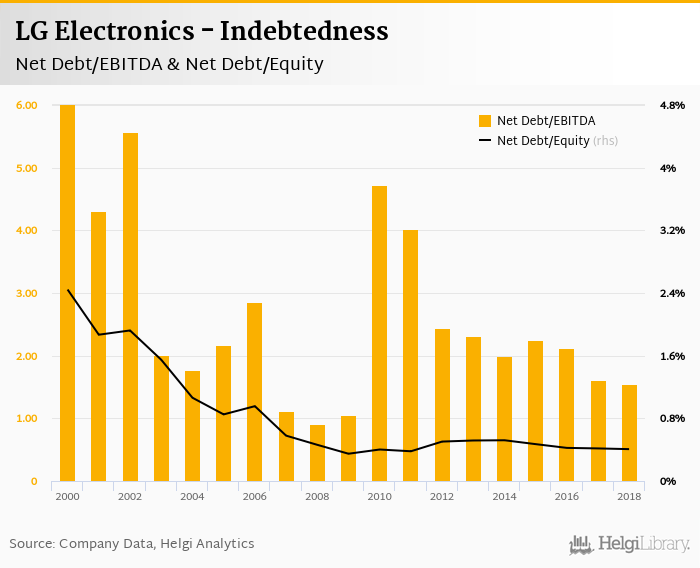 LG Electronics's net debt stood at KRW 6,631 bil and accounted for 0.407% of equity at the end of 2018. The ratio is down 0.009 pp compared to the previous year.