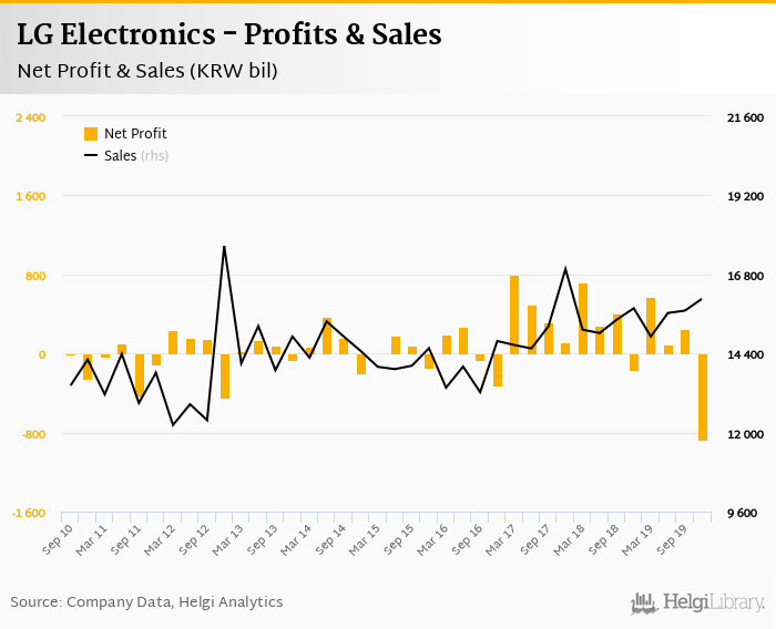 LG Electronics made a net profit of KRW -875 bil in 4Q2019, down 414% compared to the previous year. Total sales reached KRW 16,061 bil, which is up 1.83% when compared to the previous year.
