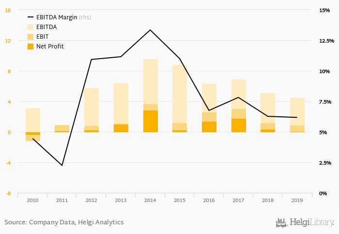 On the operating level, EBITDA reached CZK 4.51 mil, down 11.8% compared to the previous year. Over the last five years, company's EBITDA has fallen 14.0% a year on average.