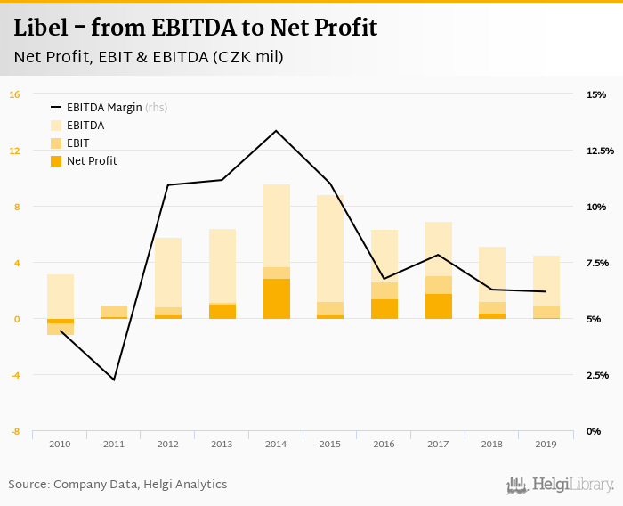 Libel made a net profit of CZK 0.083 mil with revenues of CZK 73.0 mil in 2019, down by 76.8% and down by 10.6%, respectively, compared to the previous year. This translates into a net margin of 0.114%.