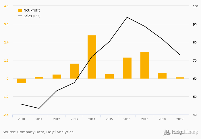 Sales have grown by 0% a year on average since 2009. They reached a high of CZK 93.7 mil in 2016 and a low of CZK 43.4 mil in 2011.