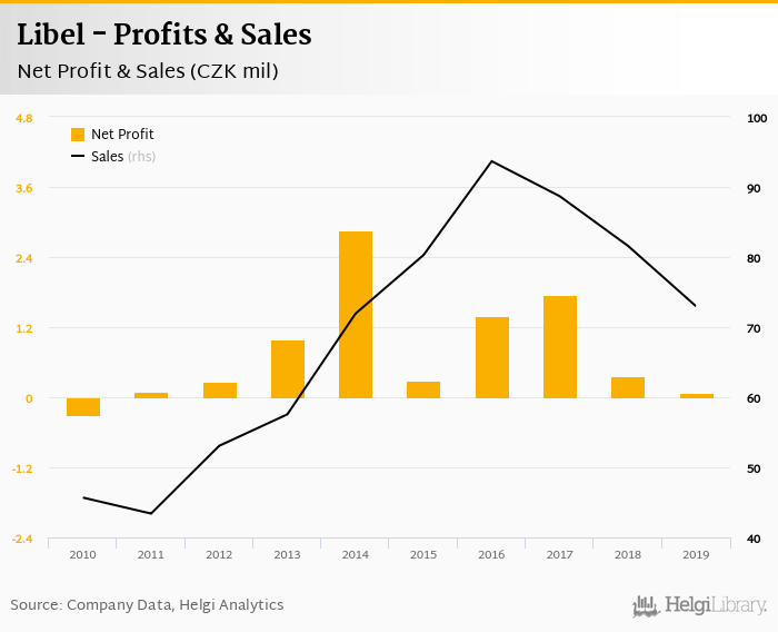 Libel made a net profit of CZK 0.083 mil in 2019, down 76.8% compared to the previous year. Total sales reached CZK 73.0 mil, which is down 10.6% when compared to the previous year.