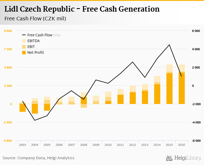Lidl Czech Republic made a net profit of CZK 4,104 mil with revenues of CZK 43,748 mil in 2016, up by 1.77% and up by 14.1%, respectively, compared to the previous year. This translates into a net margin of 9.38%.