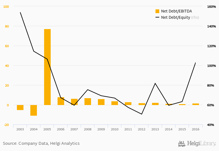 Historically, the firm’s net debt to equity reached a high of 154% in 2003 and a low of 15.5% in 2001 between 2001 and 2016. The average for the last five years was 71.5%.
