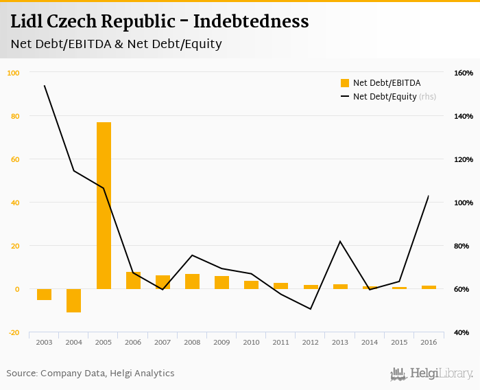 Lidl Czech Republic's net debt stood at CZK 8,051 mil and accounted for 103% of equity at the end of 2016. The ratio is up 39.8 pp compared to the previous year.