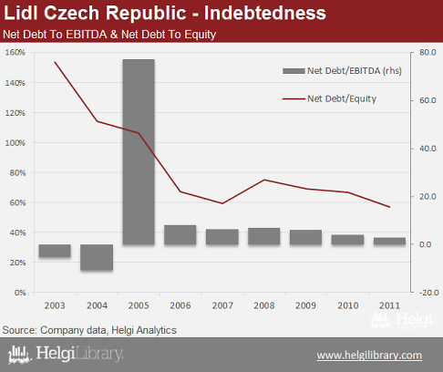 Since its entrance to the Czech Republic in 2003, Lidl has increased its sales more than 6-fold to over CZK 23 bil in 2011. From heavy losses exceeding CZK billion in 2003-2004, the Company has achieved a net profit of nearly 1.2 bil with ROE of 12.5% in 2011. As a result, Company's net dropped from 150% of equity to only 57% at the end of 2011