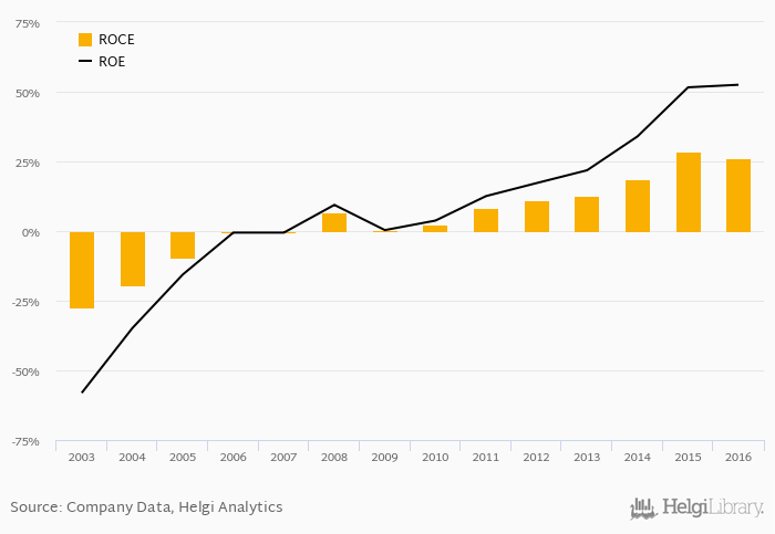 The result implies a return on equity of 52.5% and a return on invested capital of 26.1% in 2016. That is compared to an average of 35.4% and 19.4% over the last five years.