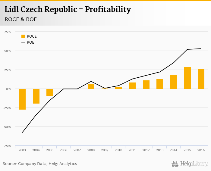 As far as Lidl Czech Republic's peers are concerned, Ahold Czech Republic generated ROE of 0.294% and ROCE of 0.036% in 2016. BILLA Czech Republic's profitability reached 13.5% and 11.3%, respectively. Kaufland Czech Republic operated with 18.3% and 8.22% returns in 2016.